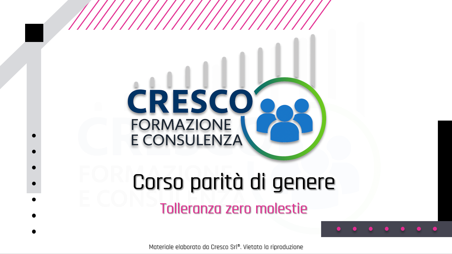 Benvenuta e benvenuto al corso dedicato alla prevenzione delle molestie e alla promozione della parità di genere nei luoghi di lavoro.